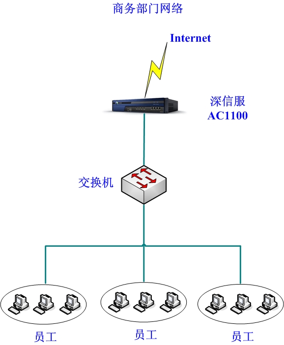 通過深信服AC1100上網(wǎng)行為管理網(wǎng)關(guān)來(lái)實(shí)現(xiàn)公司商務(wù)部門員工上網(wǎng)行為的管理、記錄、審計(jì)工作。
