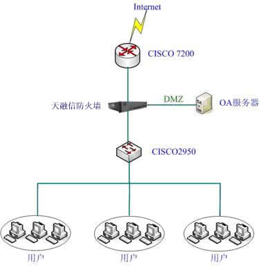 本方案在原有網(wǎng)絡結構上,在CISCO 7200路由器和 CISCO 2950交換機之間加入天融信NGFW4000防火墻,防火墻采用透明模式,保持原有網(wǎng)絡結構不變。通過防火墻的安全功能和上網(wǎng)行為管理功能保證政府內網(wǎng)的安全和對內網(wǎng)用戶上網(wǎng)行為進行有效管理。通過在CISCO 2950交換機上綁定客戶機MAC地址和在客戶端安裝ARP防火墻實現(xiàn)對內外ARP攻擊的有效防護。OA服務器從原來的內網(wǎng)移動到防火墻的DMZ區(qū)域。